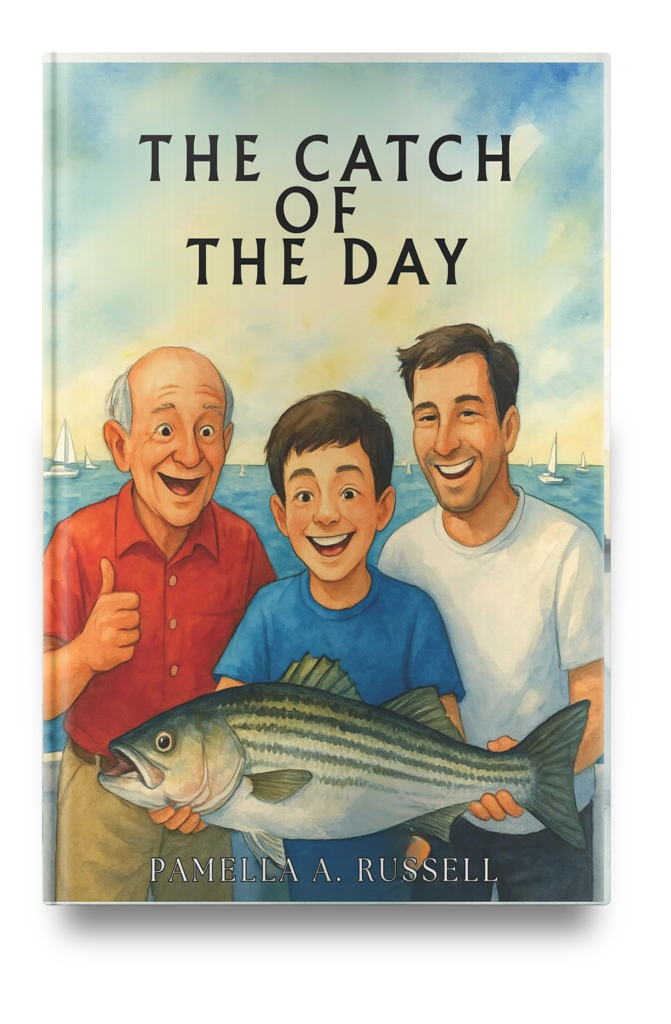 The Catch of the Day was inspired by a 1995 newspaper article about a man who lost his dentures overboard while on a fishing trip in the Netherlands. The story is about a boy who goes striper fishing (also known as rockfish or striped bass) with his father and grandfather.
